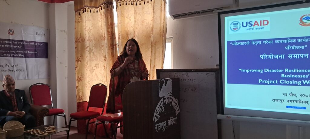 महिलाले नेतृत्व गरेका व्यबसायिक कार्यहरुको बिपद उत्थानशिलता सम्बन्धि सोमबार राजापुरमा आयोजित समापन कार्यक्रममा अध्यक्ष ज्ञवालीले सम्बोधन गर्दै महिला व्यबसायिक बनेर आय आर्जनका लागि आर्थीक अभाव नै मूख्य चुरो कुरो रहेको बताईन् । ८ महिना अघि देखि बिपदले समस्याग्रस्त वनाएका महिला उद्यमलाई प्रबद्धन गर्ने उदेश्य अनुरुप राजापुर १ काम सुरु गरिएको उनले जानकारी दिईन् ।