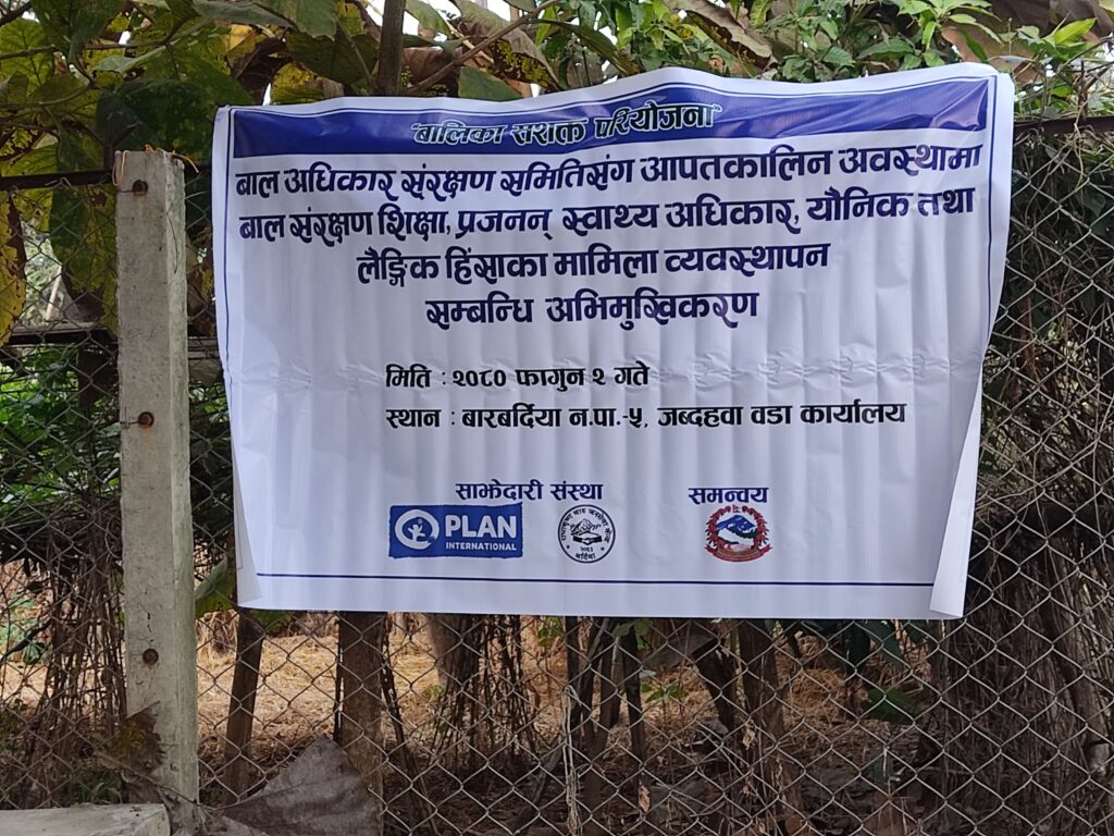 वडा स्तरीय बाल अधिकार संरक्षण समितिसंग आपतकालीन अवस्थामा बाल संरक्षण शिक्षा, प्रजनन् स्वास्थ्य अधिकार, यौनिक तथा लैंगिक हिंसाका मामिला व्यवस्थापन सम्बन्धी अभिमूखिकरण गरिएको छ । अभिमुखिकरणमा बारबर्दिया नगरपालिका वडा नम्बर ५ को बाल अधिकार समितिका पदाधिकारी, सदस्य तथा सरोकारवालाहरुको काम, कर्तब्य र अधिकार, बालबालिका दुरब्यबहारको जोखिममा पर्न सक्ने वा परेकाहरुलाई बाल अधिकार समितिले गर्नु पर्ने सिफारिशको बारेमा जानकारी गराईएको हो ।