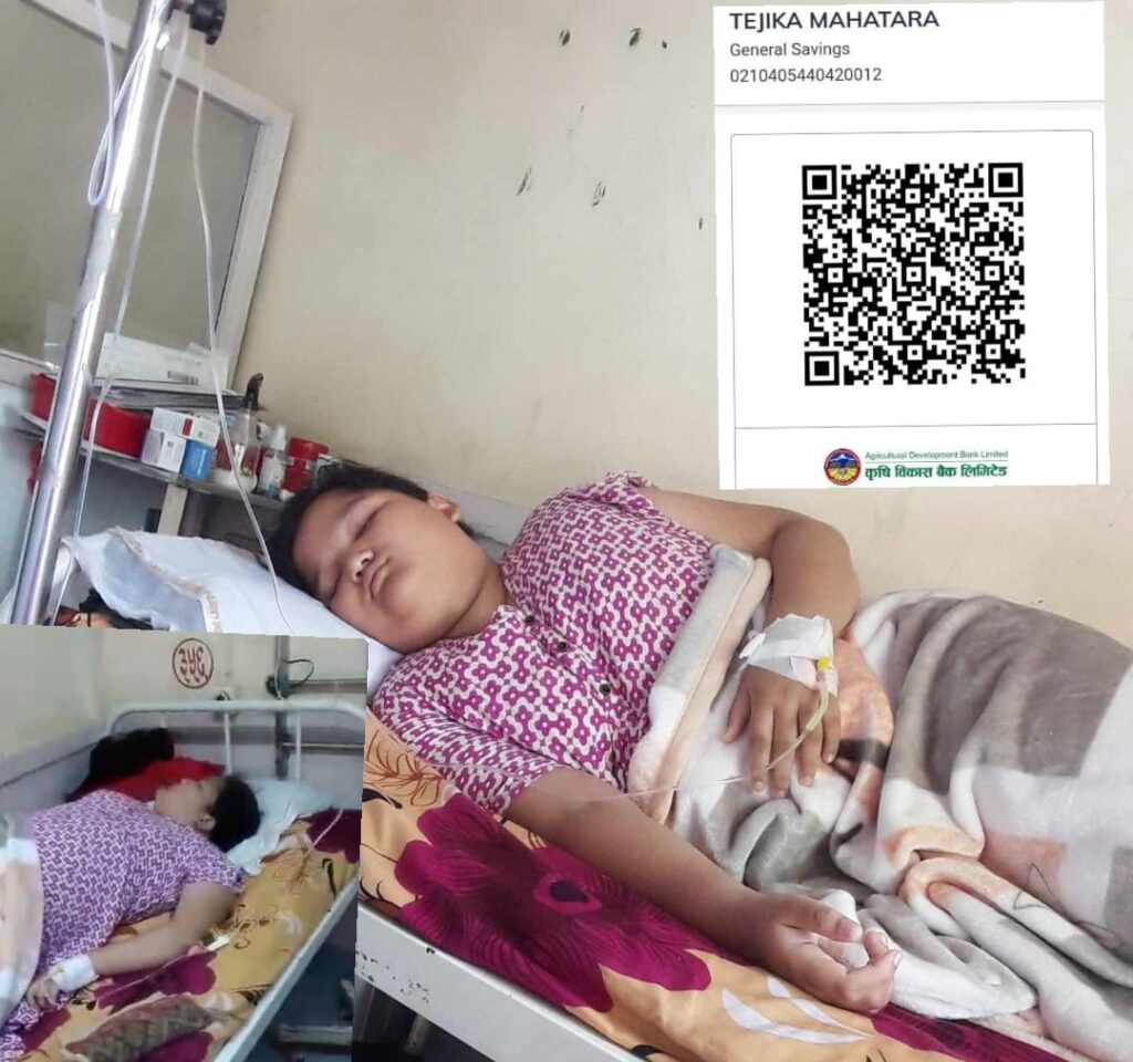 १२ बर्षिया तेजिला महतारा लाइ सहयोग गर्न चाहने इच्छुक महानुभावले कृषि विकाश बैंक, महाराजगञ्ज शाखामा तेजिका महताराको नाममा रहेको खाता न. ०२-१०४-०५४४०४२०-०१-२ मा वा क्यु आर कोड मार्फत पनि सहयोग गर्न सकिन्छ।