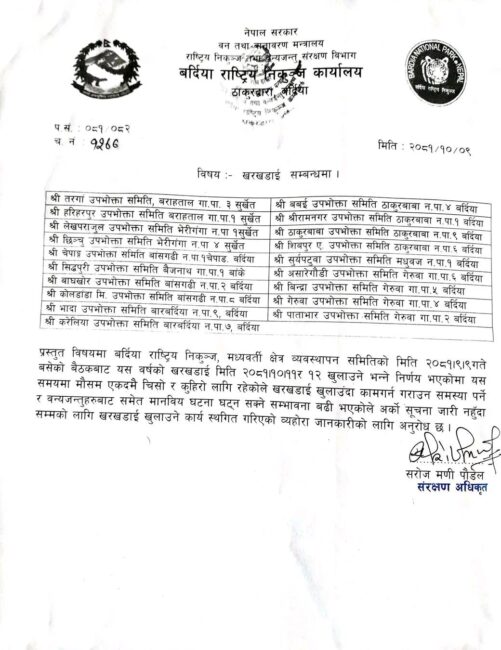गेरुवा । बर्दिया राष्ट्रिय निकुञ्जमा खुल्ला गर्ने भनिएको खरखडाई स्थगित भएको छ । अत्याधिक चिसोका साथै कुहिरोका कारण निकुञ्जमा काम गर्न नराउनका समस्या हुनुका साथै कुहिरोका कारण वन्यजन्तुसँग जम्काभेट भई मानविय घटना घट्न सक्ने भन्दै खरखडाई स्थगित गरिएको हो ।