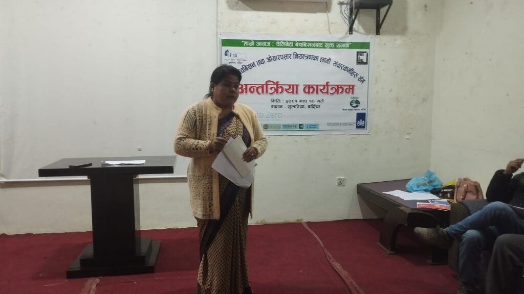 नेपाल पत्रकार महासंघ बर्दियाको अध्यक्ष निर्मल घिमिरेको अध्यक्षतामा भएको सो कार्यक्रममा माइती नेपाल गुलरिया बर्दियाको संयोजक गायत्री रिमालले सन् २०२४ जनवरीदेखि डिसेम्बरसम्म माइती नेपालले गरेका क्रियाकलापहरू बारे जानकारी गराउँदै ३ सय ३५ जनालाई जोखिमपूर्ण यात्रामा रही सिमानाबाट उद्धार गरी आवधिक गृहमा प्रवेश गराई आवश्यक परामर्श प्रदान गरिएको बताउनुभयो ।