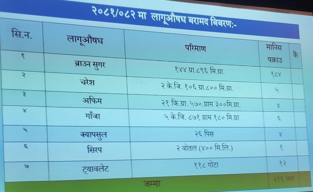उपरिक्षक खनालले चरेश, अफिम, गाँजा, क्यापसुल, सिरप र ट्याब्लेट सहित अन्य लागूपदार्थ पनि बरामद गरिएकाे जानकारी गराउँदै अफिम २१ किलोभन्दा बढी, गाँजा ५ किलो ८ सय ७१ ग्राम जफत गरिएको उल्लेख गर्नुभयाे । यी आँकडाहरूले बर्दियालाई ‘लागूऔषध पारवहन मार्ग’ मात्रै होइन, उपभोगको खतरनाक केन्द्र पनि बन्दै गएको चित्रण गर्छन् ।