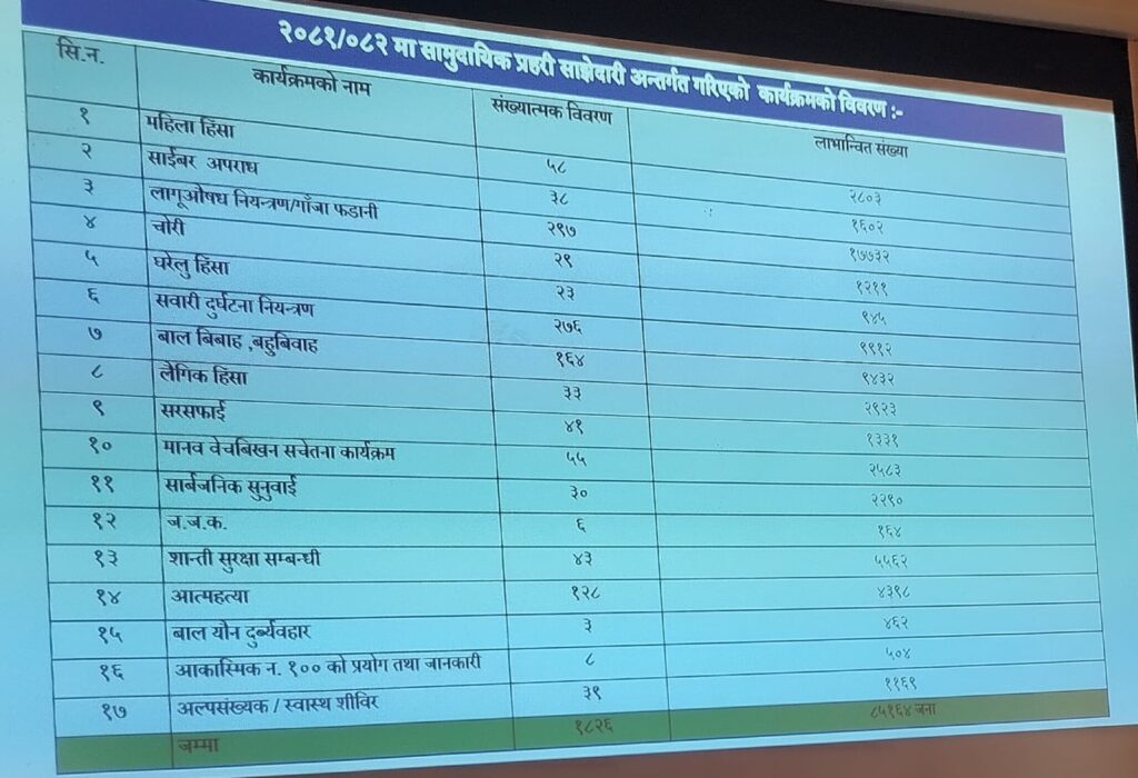 बर्दिया — जिल्ला प्रहरी कार्यालय बर्दियाले आर्थिक वर्ष २०८१/०८२ मा भएको प्रगतिहरू पत्रकार भेटघाट कार्यक्रमकाे आयोजना गरी सार्वजनिक गर्यो । प्रगतिहरू सार्वजनिककाे क्रममा युवाहरू लागूऔषध ब्राउन सुगरको कुलतमा फसिरहेकाे र १८ वर्ष तलका युवा देखि ६० वर्ष माथिका वृद्धले गरेकाे आत्महत्या दर बढेकाे पाईयाे ।