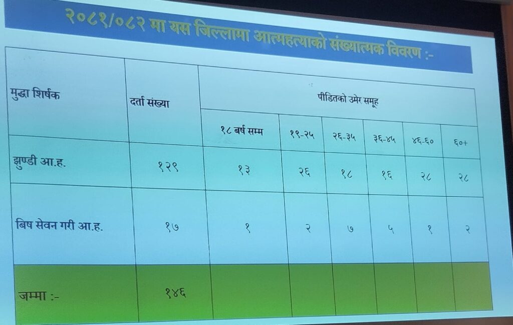 अर्कोतर्फ, प्रहरीकाेे तथ्यांकमा आत्महत्याका दर झन् भयावह छन् । २०८१/०८२ मा जिल्लाकाे १ सय ४७ जनाले आत्महत्या गरेका छन् । झुन्डिएर ज्यान दिनेको संख्या १ सय २९ रहेको छ भने विष सेवन गरेर आत्महत्या गर्ने १८ जना छन् । सबैभन्दा धेरै आत्महत्याका घटना ६० वर्ष माथिका र ४६–६० वर्ष उमेर समूहमा देखिएका छन्, तर किशोर र युवा समुह पनि पछाडि छैनन् । १८ वर्षमुनिका १४ र १९ देखि २५ वर्षका २८ जनाले आत्महत्या गरेकाे तथ्यांकमा देखिन्छ ।