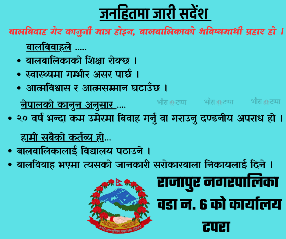 बर्दिया – राजापुर नगरपालिकाले आर्थिक वर्ष २०८१/०८२ को बार्षिक प्रगति समीक्षामा समष्टिगत प्रगति सन्तुलित रहेको निष्कर्ष निकालेको छ। नगर प्रमुख दिपेश थारु, उप–प्रमुख मनकलाकुमारी चौधरी, प्रमुख प्रशासकीय अधिकृत दशरथ बुढा, नगरका १० वटै वडाध्यक्ष, विषयगत शाखा प्रमुख तथा पदाधिकारीहरूको उपस्थितिमा शुक्रबार नगर कार्यालयमा कार्यक्रम सम्पन्न भएको हो।